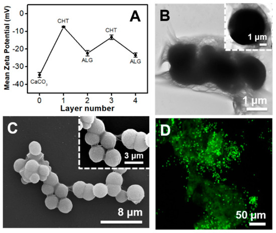 (A) Mean ζ-potential as a function of the polysaccharide layer number for the CaCO3 microparticles coated with alternating CHT and ALG layers. The odd layer numbers correspond to the CHT deposition and the even layer numbers to the ALG deposition. (B) TEM, (C) SEM and (D) FL microscopy micrographs of the core-shell CaCO3 microparticles after the deposition of two CHT/ALG bilayers. The insets in (B) and (C) show a higher magnification of the TEM and SEM images, respectively. The inset in (C) also shows the high surface roughness of the core-shell microparticles.