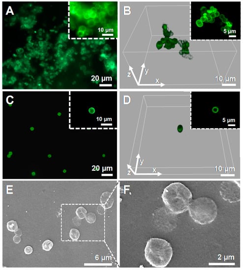 (A,C) FL microscopy and (B,D) CLSM micrographs of (CHT/ALG)2-based hollow multilayered microcapsules before (A,B) and after (C,D) the dialysis purification step. Green channel: FITC-labeled CHT. The insets in B,D correspond to the middle plane of the microcapsules. (E,F) SEM micrographs of the (CHT/ALG)2-based hollow multilayered microcapsules after dialysis, showing folds and creases in their structure due to the drying procedure.