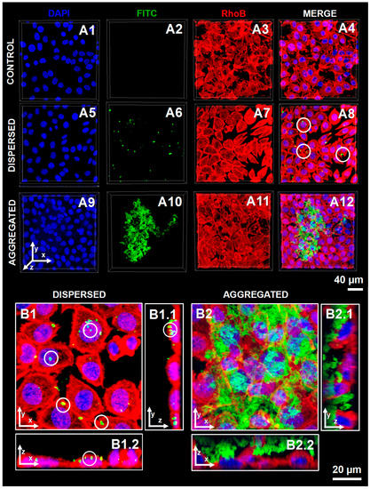 The cellular uptake of polysaccharide-based hollow microcapsules was investigated by incubating cultured L929 fibroblasts with either dispersed or aggregated capsules comprising FITC-CHT/ALG multilayers. Figure 4 summarizes the data obtained by CSLM, where cells nucleus and their cytoskeleton were stained with blue-fluorescent DAPI and red-fluorescent RhoB-phalloidin, respectively. Regarding the L929 cell morphology, no significant differences were observed after the contact between these cells and the different multilayered microcapsules formulations, since the cells exhibit their typical fibroblast-like shape (Figure 4A1 vs. A5 and A9 and Figure 4A3 vs. A7 and A11). These results were corroborated by previous studies reporting the non-cytotoxic nature of all the materials used in this work, namely the CaCO3 microcores [55], and CHT [48] and ALG [49] biopolymers, highlighting the suitability of these particles as cell internalization devices. The comparison of Figure 4A8 and A12 demonstrates that, after a 24 h incubation period, aggregated hollow multilayered microcapsules were not internalized by cells, remaining adsorbed on the cell membrane. In contrast, well-dispersed (FITC-CHT/ALG)2-based hollow microcapsules were incorporated within L929 cells, as easily seen on the 3D-reconstructed CSLM images (see Figure 4B). Indeed, the internalized microcapsules, marked with a white circle, appear in yellow as an overlap between the green and red fluorescence channels.
