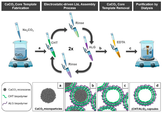 Schematic illustration of the synthesis of (a) CaCO3 core microparticles, (b) core-shell microparticles with two CHT/ALG bilayers, (c) (CHT/ALG)2-based hollow multilayered microcapsules after CaCO3 core template dissolution with EDTA, and (d) well-dispersed (CHT/ALG)2-based hollow multilayered microcapsules after purification by dialysis.