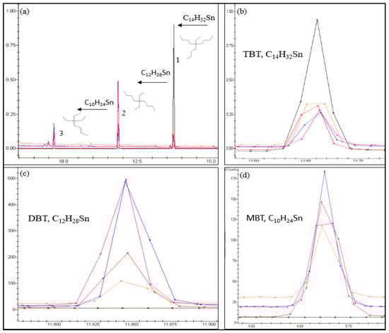 - Segovia-Martinez, L.; Bouzas-Blanco, A.; Campíns-Falcó, P.; Seco-Torrecillas, A. Improving detection limits for organotin compounds in several matrix water samples by derivatization-headspace-solid-phase microextraction and GC–MS. Talanta 2010, 80, 1888–1893. [Google Scholar] [CrossRef] [PubMed][Green Version]