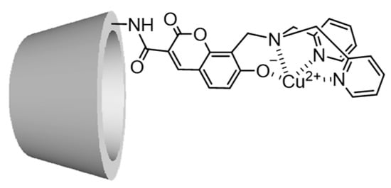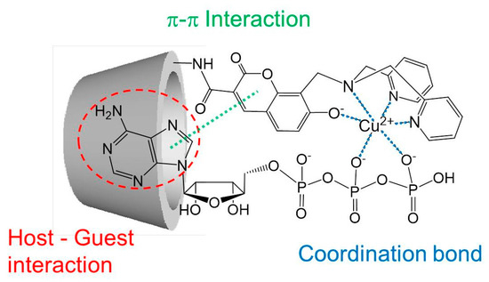 To sum up the obtained results, the supramolecular conformation shown in Figure 8 is suggested. First, the coordination of the DPA site and the hydroxyl group to the metal ion was confirmed by UV-Vis and 1H NMR measurements. Secondly, the coordination of the phosphoric moiety of ATP to the metal ion–DPA complex site was revealed by 1H NMR experiments. Thirdly, the interaction between the adenine moiety of ATP and the coumarin fluorophore was implied by the UV-Vis responses, although this interaction was weak. Finally, the host–guest interaction between the adenine moiety and the CyD cavity was suggested by NOESY measurements. Thus, Cu·1β was found to recognize ATP through the host–guest interaction between the adenine moiety and the CyD cavity in addition to the recognition of the phosphoric moiety by the metal ion–DPA complex site. In particular, the cavity size of CyD is a major contributor to the difference in selectivity for ATP. Therefore, the selective ATP recognition in this system is considered to markedly depend on the multipoint interaction in water.