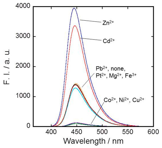 First, to evaluate the response function of modified CyDs toward metal ions, the fluorescence spectra of 1α, 1β, and 1γ were measured in the presence of Mg2+, Fe3+, Co2+, Ni2+, Cu2+, Zn2+, Cd2+, Pt2+, and Pb2+. The addition of Zn2+ and Cd2+ possessing full d-orbitals enhanced the fluorescence intensity on the basis of the PET mechanism (Figure 2) [32]. On the other hand, the addition of Co2+, Ni2+, and Cu2+ possessing free d-orbitals quenched the fluorescence intensity due to the mechanisms of energy transfer (ET) or ligand to metal charge transfer (LMCT) [33,34]. Probes 1α, 1β, and 1γ exhibited the same fluorescence behavior toward the metal ions, indicating that the CyD cavity has little influence on metal ion recognition. The complexation of the DPA unit to the metal ion was confirmed by metal ion titration experiments.
