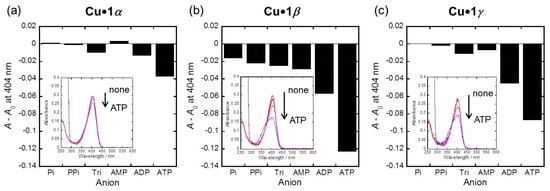 To compare the complex formation constants to ATP, the UV-Vis absorption spectra of Cu·1α, Cu·1β, and Cu·1γ in the presence of various concentrations of ATP were measured. The complex formation constants of Cu·1α, Cu·1β, and Cu·1γ to ATP were determined to be (1.7 ± 0.06) × 103 M−1, (3.3 ± 0.15) × 103 M−1, and (2.3 ± 0.12) × 103 M−1, respectively, by the Benesi–Hildebrand method [39]. These complex formation constants confirmed that Cu·1β formed the most stable supramolecular complex with ATP in water.
