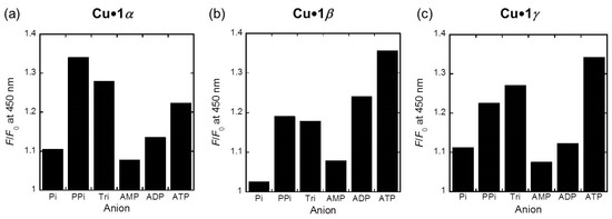 In order to examine the recognition functions for phosphoric acid derivatives, the UV-Vis absorption spectra of Cu·1α, Cu·1β, and Cu·1γ were measured in the presence of monophosphate (Pi), pyrophosphate (PPi), triphosphate (Tri), adenosine monophosphate (AMP), adenosine diphosphate (ADP), and ATP. The addition of ATP markedly decreased the absorbance at 404 nm derived from the coumarin moiety (Figure 3). The coordination of phosphate anion to Cu2+ ion weakens the bond between the phenol oxygen atom and Cu2+ ion [35]. In addition, it is known that adenine interacts with aromatic compounds, including coumarin derivatives [36,37]. Both coordination and interaction are considered to change the characteristics of the electronic state on the coumarin moiety, which results in a specific absorbance change. The fluorescence spectra of Cu·1α, Cu·1β, and Cu·1γ were also examined to investigate the potential use of these molecules as fluorescent sensors. The fluorescence intensity at 450 nm was increased upon the addition of ATP (Figure 4). At first, the Cu2+ ion induced fluorescence quenching via ET or LMCT to the Cu2+ ion. However, the coordination of the phosphate anion to the Cu2+ ion weakened the bond between the DPA unit and the Cu2+ ion, which prevented the probe from inducing fluorescence quenching [38]. Therefore, the fluorescence intensity was recovered. In the presence of ATP, Cu·1β exhibited the most significant absorbance decrease and fluorescence enhancement. This selectivity for ATP suggested two mechanisms: the host–guest interaction between the adenine moiety of ATP and the CyD cavity, and the recognition of the phosphoric moiety of ATP by the Cu2+–DPA complex site. The host–guest interaction stabilized supramolecular complex ATP/Cu·1β, which led to the specific response. These results indicated that the CyD cavity played an important role in the recognition system.