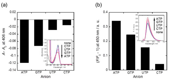 The UV-Vis and fluorescence responses revealed that Cu·1β selectively recognized ATP over other phosphoric acid derivatives. In order to evaluate the recognition selectivity of Cu·1β for nucleoside triphosphates, UV-Vis absorption spectra and fluorescence spectra were measured in the presence of each nucleoside triphosphate: ATP, guanosine triphosphate (GTP), uridine triphosphate (UTP), and cytidine triphosphate (CTP). The addition of each nucleoside triphosphate decreased the absorbance and enhanced the fluorescence intensity of Cu·1β (Figure 5). In particular, Cu·1β selectively recognized ATP over the other nucleoside triphosphates. This selectivity is considered to be based on the host–guest interaction between the nucleobase and the CyD cavity. Adenine is known to interact well with the CyD cavity compared with the other nucleobases [17]. This result also disclosed that the CyD cavity is involved in the recognition. Moreover, Cu·1β selectively recognized a purine base over a pyrimidine base, indicating the potential for use as receptors capable of distinguishing between purine and pyrimidine type nucleoside triphosphates.