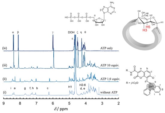 In order to clarify the coordination and interaction between Cu·1β and ATP, the 1H NMR spectra of complex Zn·1β were measured in the presence and absence of ATP. In general, it is difficult to evaluate the NMR spectra of the Cu2+ complex owing to the paramagnetism of the Cu2+ ion. Upon the addition of ATP, shifts of proton peaks assigned to h and i derived from the DPA site were noted (Figure 6), indicating that the Zn2+–DPA complex site recognized the phosphoric moiety of ATP [40,41,42]. Shifts of proton peaks assigned to b and c derived from the coumarin moiety were also observed, revealing that the hydroxyl group is associated with the coordination to Zn2+ ion.