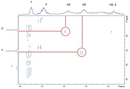 We also analyzed the supramolecular conformation of the ATP/Cu·1β complex by conducting nuclear Overhauser effect spectroscopy (NOESY) measurements of complex Cu·1β. In the NOESY measurements, protons in close proximity to each other give rise to correlation peaks [43,44]. Correlations between the protons derived from the adenine moiety of ATP (α and β) and the protons derived from the inside cavity of CyD (H3 and H5) were observed (Figure 7). The results suggested that the adenine moiety interacted with the inside cavity of CyD due to host–guest interactions. If the NOESY spectra of Cu·1β could be measured, much stronger correlations would be expected because the Cu2+ complex exhibited the higher binding ability to ATP.