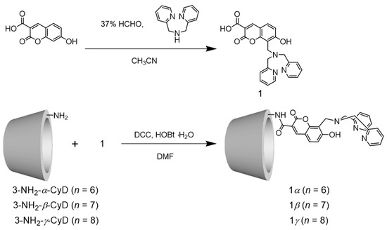 Fluorescent probe 1, which possesses coumarin as the fluorophore and DPA as the recognition site, was synthesized by the Mannich reaction [30]. Probe 1 and 3-NH2-(α, β, or γ)-CyD were coupled by a condensation reaction [31]. The crude product was purified by reverse-phase column chromatography to obtain 1α, 1β, and 1γ. All the samples were identified by 1H NMR measurement and elemental analysis.