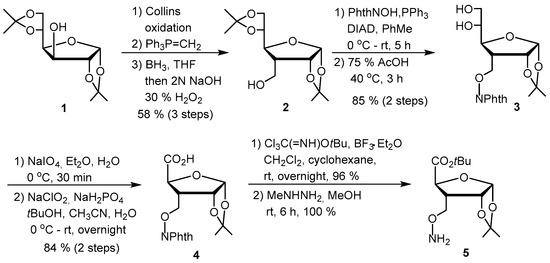 The high nucleophilicity of hydroxylamine derivatives as well as the unique structural and chemical properties of the N-O, oxime and N-oxyamide bonds have triggered the O-amino functionalization of biomolecules like peptides, proteins, carbohydrates, nucleosides and nucleotides. Due to repulsion between the lone pairs of the electron of the nitrogen and oxygen atoms, the N-O bond of hydroxylamine derivatives has unusual conformational properties, which have been exploited to obtain particular N-O turn structures in aminooxy acid-derived peptides for the preparation of new foldamers, anion receptors or channels [1,2]. The N-O bond is relatively sensitive to radical conditions because of the low N-O bond dissociation energy [3]. Oximes show higher hydrolytic stability than hydrazones [4], while the N-oxyamide linkage is resistant to chemical hydrolysis [1]. Aminooxylated carbohydrates and glycoconjugates are attracting the increasing interest for the understanding of the glycobiology and for diverse biomedical applications [3,5]. N-, O-glycosyl hydroxylamines as well as N-hydroxyamino and O-amino sugars have been developed over the last twenty years. Various chemically modified oligonucleotides have also been reported, with an increasing number showing up as drug candidates for oligonucleotide therapies [6,7,8,9]. Among them, O-amino nucleosides have been prepared for the development of human UDP-GlcNAc 4-epimerase inhibitors [10], modified oligonucleotides [11] or for next generation sequencing [12]. N-O, N-oxyamide or N-alkoxycarbamate-linked oligonucleotides have also been synthesized as oligonucleotides mimics [13,14,15,16,17]. The focus of this article is to summarize our own efforts in the preparation of O-amino sugar and nucleoside derivatives, including sugar aminooxy acids, glycosyl α-aminooxy acids, O-aminooxy nucleosides and nucleo-aminooxy acids for the generation of N-oxyamide-linked oligosaccharides, glycopeptides, glycolipids, and oligonucleoside mimics.
