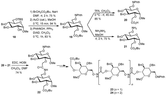 Synthesis of pyranosidic glycoaminooxy acid 20 and oligosaccharide mimics 22–24.