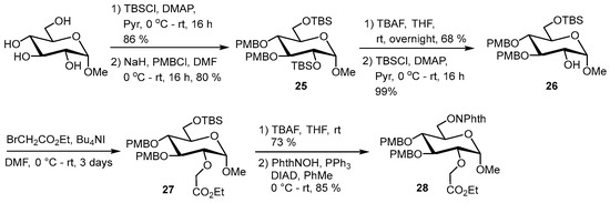 We then decided to use acid-sensitive para-methoxybenzyl groups (Scheme 5) [28]. First, methyl α-d-glucopyranoside was selectively protected with TBS and para-methoxybenzyl (PMB) groups to 25 and 26. Contrary to compound 18, the 2-O-alkylation of 26 has necessitated the optimization of the reaction conditions due to the very low conversion. The best conversion (64%) was obtained by slow addition of BrCH2CO2Et after formation of the alcoolate. The phthalimidooxyl group has been introduced under Mitsunobu conditions after desilylation, leading to the PMB-protected glycoaminooxy ester 28. The efficient deprotection of the PMB has been demonstrated in the corresponding glycolipids mimics (vide infra).
