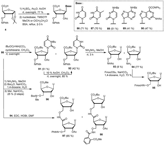 We have designed nucleoside aminooxy acids as novel building blocks for the development of stable oligonucleotide mimetics [35]. Replacement of the ionic phosphodiester by the neutral N-oxyamide linkage would not only increase its cellular permeability but also enhance its resistance to extra- and intracellular nucleases degradation. Synthesis of modified RNA oligomers has attracted renewed interest since the discovery of small interfering RNA (siRNA) for gene regulation [6]. We are particularly interested in the development of ribonucleoside aminooxy acid which could be further used for the generation of N-oxyamide-linked oligoribonucleosides. From the previously prepared furanosidic glycoaminooxy acid 4, five nucleoside aminooxy acids 86–90 have been synthesized through N-glycosylation in the presence of N,O-bis(trimethylsilyl)acetamide (BSA) and trimethylsilyl trifluoromethanesulfonate (TMSOTf) after acidic hydrolysis of the acetonide and acetylation of the resulting hydroxyl groups (Scheme 12). Uridine derivative 86 was chosen for the investigation for N-oxyamide-linked oligomer formation. Treatment with the tert-butoxytrichloroacetimidate led to the formation of the desired tBu ester 92 along with compound 91 bearing an extra tBu group on the nitrogen atom of the uracil moiety. Compound 91 could be converted to 92 using 10% AcOH in CH2Cl2. Hydrazinolysis of 92 led to the removal of both phthaloyl and acetyl group to 94, along with a small amount of transacetylation product 93. The oxyamine can be further protected with Fmoc group (95). Boc protected N-methyl nucleoside aminooxy ester 96 can also be prepared from 86. Coupling of the building blocks 86 and 94 led to the N-oxyamide-linked dinucleoside 97. We have observed the formation of the methanolysis product 98 during the column chromatography with CH2Cl2/MeOH as eluent.