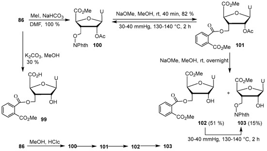 We then decided to investigate the stability of uridine derivative 86 in the presence of MeOH (Scheme 13). Treatment of 86 with K2CO3 in MeOH at room temperature led to the ring-opening product 99 in 30% isolated yield. Esterification of 86 in DMF led quantitatively to the methyl ester 100. Subsequent deacetylation with NaOMe led firstly to the phthalimido ring-opening product 101 which can be converted back to 100 by heating at 130–140 °C under reduced pressure. Further reaction with NaOMe deprotected the 2’-O-acetyl group, providing a mixture of compounds 102 and 103. Similar phenomena have been observed during the saponification of 100 with K2CO3 or NaOH (4M) in MeOH. The ring closure reaction of the phthalimido group can be achieved by heating 102 under reduced pressure. Under acidic condition in MeOH, we have observed successive transformations of compound 86 to the methyl ester 103 through the intermediates 100 to 102 on thin-layer chromatography (TLC).