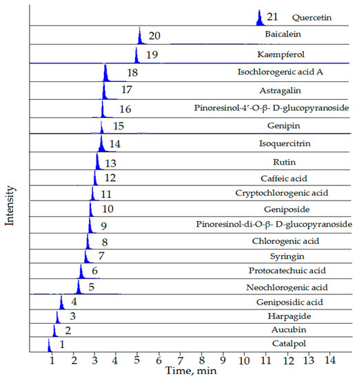 Sample Availability: Samples of the compounds (catalpol, aucubin, harpagide, geniposidic acid, neochlorogenic acid, protocatechuic acid, syringin, chlorogenic acid, pinoresinol-di-O-β-d-glucopyranoside, geniposide, cryptochlorogenic acid, caffeic acid, rutin, isoquercitrin, genipin, pinoresinol-4′-O-β-d-glucopyranoside, astragalin, isochlorogenic acid A, kaempferol, baicalein, and quercetin) are available from the authors. |