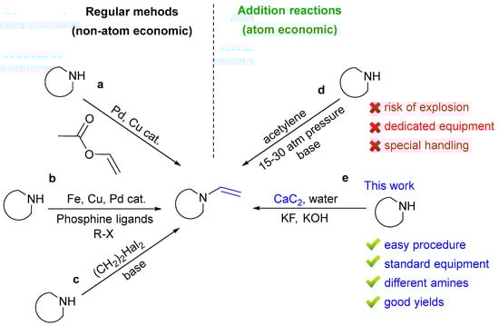 An excellent atom-economic opportunity is provided by the addition reaction of acetylene, proceeding without by-product formation, which is to say that all atoms of starting materials become incorporated into products. This reaction (Scheme 1, route d) was originally implemented by Reppe [28], and it is still used with several optimizations [29]. Arylamines can be successfully vinylated according to this procedure [30]. However, using and handling pressured acetylene is technically difficult and requires dedicated hardware [31,32]. Not surprisingly, this atom-economic approach, despite being efficient in terms of chemistry, has not found widespread application in synthetic practice.