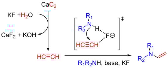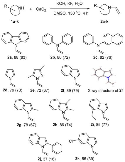 As an alternative to high pressure acetylene, calcium carbide has demonstrated a very impressive potential in organic transformations [32,33,34,35,36,37,38,39,40]. Calcium carbide is inexpensive and readily available at the large-scale commercial production level. Currently, a carbide-based synthesis is underestimated in its potential to provide not only useful intermediates for lab chemistry, but also materials and polymers for fine technology [32,40]. As representative examples, the vinylation of O-H and S-H groups has been reported [36,37,38,39,40]. However, the vinylation of the N-H group is challenging, and only indole derivatives have been studied [41]. Recently, we developed a concept involving a solid acetylene reagent, where the reactivity of calcium carbide and in situ generated acetylene was tuned by the addition of KF [38].