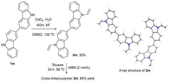 3,3′-bicarbazole (1m) was chosen as a model substrate for further polymerization experiments in connection with the promising potential of polyvinyl carbazole (PVC) in optoelectronics. One-pot insertion of two vinyl groups is challenging, since spontaneous oligomerization may readily occur during the synthetic procedure. Nevertheless, the individual double vinylated 3,3′-bicarbazole (2m) was isolated in 32% yield using the developed procedure with calcium carbide (Scheme 5). The presence of two vinyl groups in the monomer was clearly confirmed by X-ray analysis (Scheme 5).