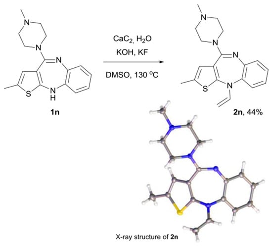 The developed vinylation procedure was successfully utilized for post-modification of a drug substance. Olanzapine (Zyprexa) is thienobenzodiazepine used for the treatment of schizophrenia and bipolar disorder [45]; it acts by suppressing dopamine and serotonin receptor activities. Currently available antipsychotic drugs have certain limitations. Considerable academic efforts are aimed at enhancing their properties (e.g., by chemical post-modification), including the development of new platforms for drug delivery [46]. The insertion of vinyl groups modulates the functionality of a biologically active benzodiazepine core and creates novel opportunities for molecular binding. An olanzapine-containing polymer, slowly releasing the active units by gradual depolymerization and/or devinylation upon delivery, could be of great therapeutic relevance. The vinylation of olanzapine (1n) under the developed conditions proceeded smoothly (Scheme 5), and the vinyl derivative (2n) was isolated in a pure form as a solid substance. The molecular structure of product 2n was determined by X-ray analysis (Scheme 6).