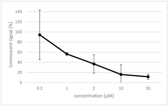 Rosmarinic acid was investigated for its inhibitory effect on reactive oxygen species (ROS) production by Nox4. Therefore, the Nox4 gene was expressed in human embryonic kidney (HEK) cells [], and a luminol based assay was established to detect ROS generated by the expressed protein. The effect of rosmarinic acid on HEK Nox4 cells was investigated using different concentrations between 0.2 and 20 µM of the compound, and was determined by a decrease in the luminescent signal (Figure 3). A concentration of 0.2 µM rosmarinic acid showed no significant effect. However, the effect rapidly increased at higher concentrations, and already, 20 µM rosmarinic acid completely quenched the measured luminescent signal. The IC50 value of rosmarinic acid was determined to be 1 µM.