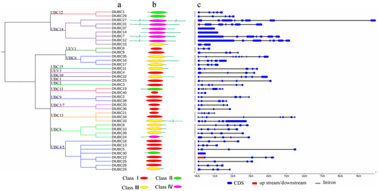 Phylogenetic relationships, architecture of conserved protein motifs and gene structure in DlUBC genes from longan. (a) The neighbor-joining (NJ) tree on the left includes 40 DlUBC proteins from longan; (b) The architecture of conserved protein motifs of DlUBC proteins with the name of each corresponding protein is shown on the left. The position of the UBC domain is indicated in the panel. The different colors indicate the four E2 subtypes of the UBC domains; (c) Exon/intron structures of UBC genes from longan. Untranslated 5′ and 3′ regions, exon(s), and intron(s) are represented by red, blue boxes, and gray lines, respectively. The scale bar represents 1000 bp.