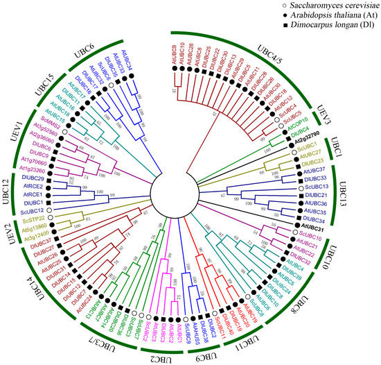 Phylogenetic analysis of the longan UBC proteins with orthologous members from Saccharomyces cerevisiae and Arabidopsis. The neighbor-joining (NJ) phylogenetic tree was constructed with MEGA 6.0 software. Different groups of DlUBC proteins are indicated by a circle and different colors.