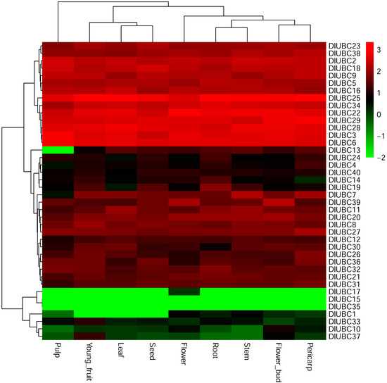 Expression profiles of DlUBC genes across different tissues and developmental stages in longan. Heat map of the hierarchical clustering of 40 UBC genes across different tissues analyzed in this study. The color scale represents log10 expression values; red and green colors indicate lower or higher transcript abundance compared to the relevant control, respectively.