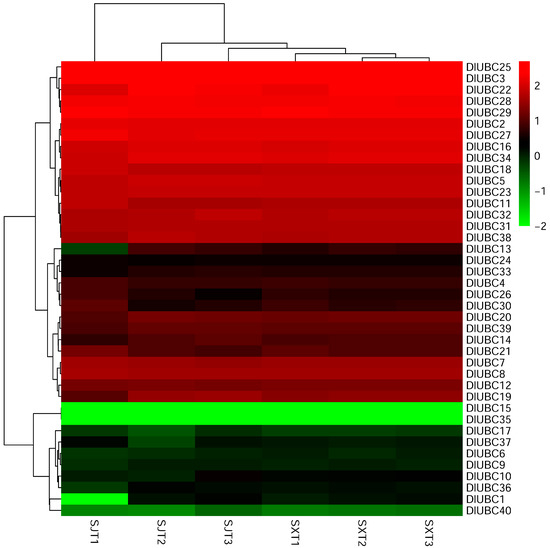 Heat map of the comparative expression level of UBC genes during the three flowering stages of the ‘SJ’ and “SX”. Genes with comparatively low expression values are shown using shades of green, and high expression values are represented using shades of red. The three flowering stages of SJ are indicated by SJT1, SJT2 and SJT3. The three flowering stages of SX are indicated by SXT1, SXT2 and SXT3.