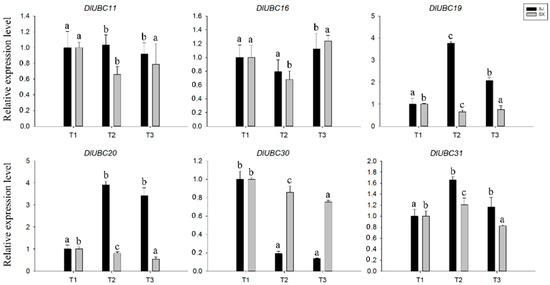 Relative expression levels of six DlUBCs during the three flowering stages of the two longan species by qRT-PCR. For each gene, the relative expression level in T1 (dormant apical bud) was set as one, and the longan actin gene was used as the internal expression control. The data represents the mean ± SD of three replicates. Values with the same letter were not significantly different when assessed using Duncan’s multiple range test (p < 0.05, n = 3).