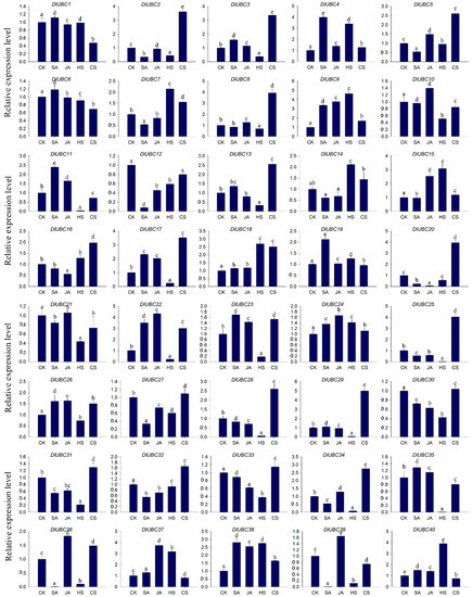 Subsequently, the expression patterns of 40 DlUBC genes were investigated in response to hormonal and various stress using qRT-PCR (Figure 6).