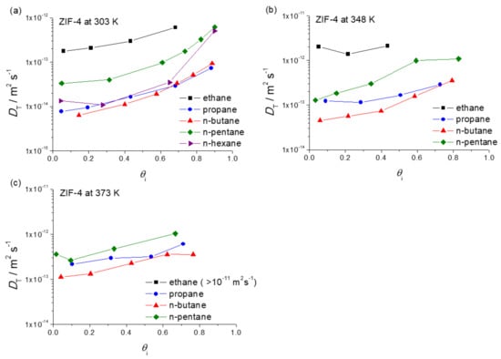 Transport diffusivities of n-alkanes in ZIF-4 as a function of fractional pore occupancy at (a) 303 K; (b) 348 K and (c) 373 K. Note that n-hexane was measured only at 303 K.
