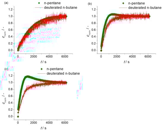 The data in Figure 1 were obtained from time-resolved uptake measurements with a spectral resolution of 16 cm−1 and a temporal resolution between 0.6 and 3.7 s (depending on the number of scans) using the single element detector. The integration of the time-resolved spectrum over the characteristic IR band of each guest molecule (C-H vibration band near 2950 cm−1) resulted in an integral “uptake curve”. By fitting the uptake curve with Equation (1) the transport diffusivity was calculated. In the two-component experiments, on the other hand, the integration was carried out over not only the C-H band but also the C-D band to distinguish the uptake of the deuterated n-butane from that of n-pentane.