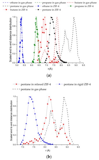 (a) Distributions of the end-to-end chain lengths of C2–C5 alkanes adsorbed in ZIF-4 compared with those in the gas phase. n-Pentane and n-butane molecules coil up significantly to fit inside the cages of ZIF-4; (b) Distributions of the end-to-end chain lengths of n-C5 in the gas phase, in rigid ZIF-4, and in the relaxed ZIF-4 structure from Figure 5b.