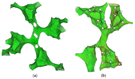 ZIF-4 is made of tetrahedral Zn2+ nodes connected by imidazolate linkers in a CAG topology, with the nitrogen atom on the imidazolate being the site of coordination. CAG is known to have two kinds of pore regions, the “cages” (the larger cavities) and the “junctions,” which connect four different cages. Each unit cell has eight cages, each of which opens into two junctions through separate cage windows. These windows are each lined with four freely rotating imidazolate linkers, which enable the “swinging-opening” motion of the cage windows [5]. The cages in ZIF-4 have a maximum diameter of 5.14 Å, and the pore-limiting diameter at the cage windows is 2.45 Å for the guest-free framework. Some of this structural information (calculated using Zeo++ using a 2.4 Å He probe) is summarized in Table 3. Figure 5 provides a visual representation of the pore network of ZIF-4. The distance isosurfaces in Figure 5 were calculated using Zeo++ [46] before and after the adsorption of n-pentane (with structure relaxation in Figure 5b). The framework atoms were assigned pre-defined radii and all points which are at the same set distance to the surface of the framework were then connected to form the corresponding distance isosurface.