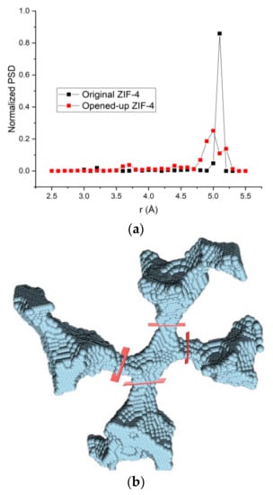 To provide another way to visualize the shape and connectivity of the pores of ZIF-4, the ZIF-4 crystal structure from Park et al. [3] was fully loaded with pentane at 1 GPa (1 molecule per cage, 8 cages per unit cell) and geometry-optimized using the DREIDING force field in Materials Studio [45], causing all of the windows to open. We then removed the guess molecules, and the “opened-up” structure was analyzed using Poreblazer [47] where it was discretized onto a uniform grid (0.2 Å spacing used here) and a probe atom (2 Å diameter used here) was placed at every grid point where there was no overlap with the framework atoms. The results, a typical pore junction and the four cages connected to it, are visualized in Figure 6b. The pore size distributions of the original ZIF-4 structure [3] and the “opened-up” structure are shown in Figure 6a.
