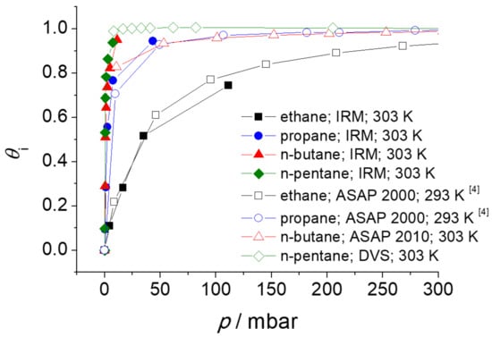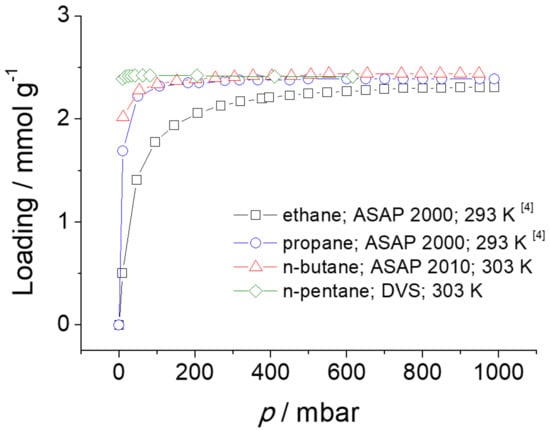 The adsorption isotherms of ethane, propane, n-butane, and n-pentane in ZIF-4 are shown in Figure 7. The data are from literature (ethane and propane) [4] and the results of measurements with the volumetric adsorption apparatus ASAP 2010 from Micromeritics (n-butane) and the gravimetric technique of dynamic vapor sorption (DVS) (n-pentane).