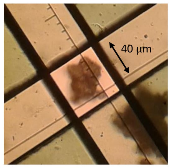 ZIF-4 agglomerate, which has been subject to IR measurements, under the microscope. The black square in the middle is the measurement window.