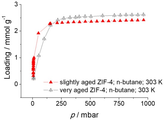 Adsorption isotherms of n-butane in slightly and very aged ZIF-4 at 303 K.