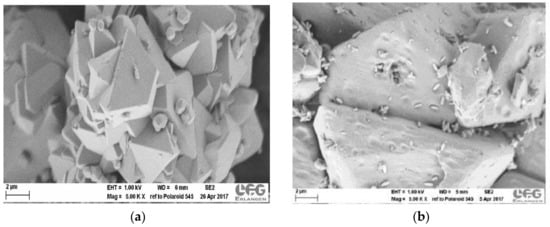 SEM images of (a) slightly aged ZIF-4 and (b) very aged ZIF-4.