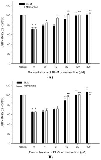 Neuroprotective effects of BL-M and memantine on Glu- or N-methyl-d-aspartate (NMDA)-induced excitotoxic neuronal cell death in the primary cultured rat cortical cells. The cultured cells (10–11 days in vitro) were exposed to 100 μM Glu (A) or 300 μM NMDA (B) for 15 min in the absence or presence of the indicated concentrations of BL-M or memantine, as described in the Section 4. Cell viability was assessed using the MTT reduction assays followed by 22–24 h incubation at 37 °C after the exposure, and expressed as % of control-treated cells (# p < 0.001 vs. control; * p < 0.05, *** p < 0.001 vs. Glu- or NMDA-treated cells, respectively). Each data represents the mean ± S.E.M. from at least three independent experiments.