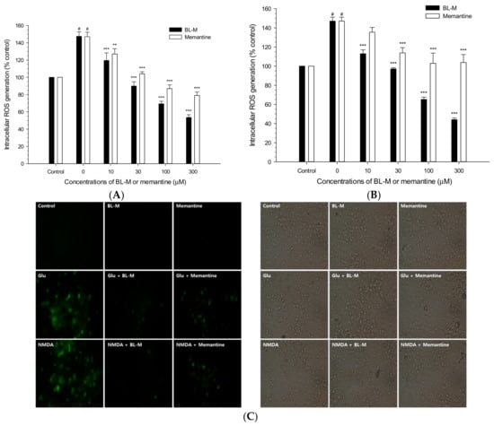 Inhibition by BL-M or memantine of Glu- or NMDA-induced intracellular ROS generation in primary cultured rat cortical cells. The cultured cells (10–11 days in vitro) were incubated with 10 μM DCFH-DA for 30 min and exposed to 100 μM Glu (A) or 300 μM NMDA (B) in the absence or presence of the indicated concentrations of BL-M or memantine, as described in the Section 4. The levels of intracellular ROS were measured at 2 h after the exposure to the respective insults, and expressed as % of control-treated cells. (# p < 0.001 vs. control; ** p < 0.01, *** p < 0.001 vs. Glu- or NMDA-treated cells, respectively). Each data represents the mean ± S.E.M. from at least three independent experiments. Representative epifluorescent (left) and bright-field (right) images of cells exposed to Glu or NMDA with or without BL-M or memantine at 10 μM are shown (C).
