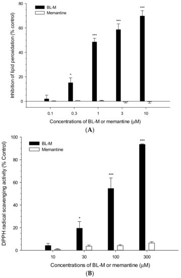 Differential antioxidant activities of BL-M and memantine. Lipid peroxidation induced by Fe2+ and l-ascorbic acid in rat brain homogenates (A) and DPPH radical scavenging activities (B) were assessed in the absence or presence of BL-M or memantine, as described in the Section 4 (* p < 0.05, *** p < 0.001 vs. control). Each data represents the mean ± S.E.M. from at least three independent experiments.