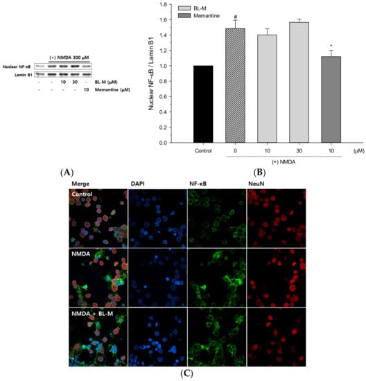 Effects of BL-M and memantine on NMDA-induced nuclear translocation of NF-κB in primary cultured rat cortical cells. Nuclear fractions obtained from the cells treated with NMDA in the absence or presence of BL-M or memantine at the indicated concentrations were analyzed by Western blotting using a primary antibody of anti-NF-κB p65 (A). Lamin B1 was used for loading control. The quantitative analysis was expressed as relative changes with respect to the control group (B) (# p < 0.001 vs. control; * p < 0.05 vs. NMDA-treated group). Each data represents the mean ± S.E.M. from three independent experiments. Representative images of immunocytochemical staining conducted in the cells exposed to NMDA with or without BL-M at 10 μM are shown (C).