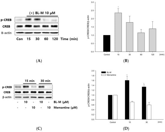 Phosphorylation of CREB by BL-M in primary cultured rat cortical cells. Cells (10–11 days in vitro) were treated with either BL-M alone (A) or BL-M or memantine (C) for the indicated periods of time, and the cell lysates were analyzed by Western blotting with a primary antibody of anti-phospho-CREB (Ser133). Total CREB and β-actin were used for loading control. The quantitative analyses were expressed as relative changes with respect to the respective control group (B, D) (* p < 0.05 vs. control). Each data represents the mean ± S.E.M. from at least three independent experiments.