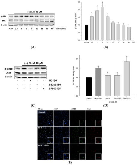ERK1/2-mediated CREB phosphorylation by BL-M in primary cultured rat cortical cells. Cells (10–11 days in vitro) were treated with BL-M for the indicated periods of time, and the cell lysates were analyzed by Western blotting using phospho-ERK1/2 antibody, as described in the Section 4 (A). Total ERK1/2 and β-actin were used for loading control. The quantitative analysis was expressed as relative changes with respect to the control group (B). The levels of CREB phosphorylation in the cells pretreated with kinase inhibitors were analyzed by Western blotting with a primary antibody of anti-phospho-CREB (Ser133) (C), and quantitatively expressed as relative changes with respect to the control group (D). Each data represents the mean ± S.E.M. from at least three independent experiments. Representative images of immunocytochemical staining conducted in the cells pretreated with U0126 using phospho-CREB antibody are shown (E) (* p < 0.05, ** p < 0.01, *** p < 0.001 vs. control; # p < 0.05 vs. BL-M treated group).