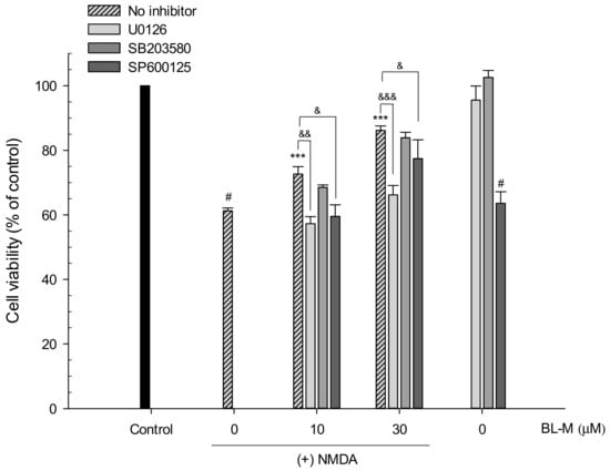Reversal of the neuroprotective effect of BL-M by U0126 in primary cultured rat cortical cells. Cells (10–11 days in vitro) were pretreated with kinase inhibitors and exposed to 300 μM NMDA for 15 min in the absence or presence of the indicated concentrations of BL-M. Cell viability was assessed by MTT reduction assays after 22–24 h of incubation at 37 °C, as described in the Section 4. (# p < 0.001 vs. control; *** p < 0.001 vs. NMDA-treated cells; & p < 0.05, && p < 0.01, &&& p < 0.001 vs. NMDA + BL-M-treated cells). Each data represents the mean ± S.E.M. from at least three independent experiments.