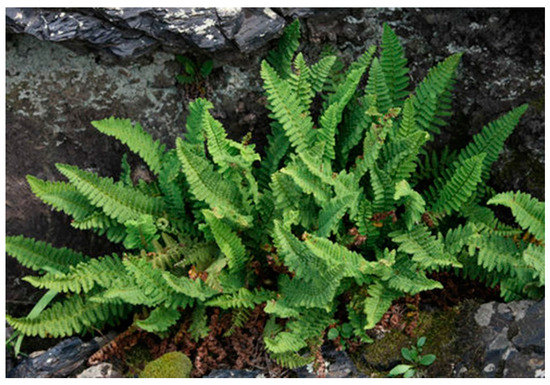 D. fragrans (Figure 1), from the Dryopteris genus of the Dryopteris family, is a deciduous perennial herb that is mostly distributed in Northeast China, Korea Japan, Russia and North America. [1,2]. The chemical components isolated from D. fragrans have exerted many biological effects [3,4,5,6]. In recent years, there have been many studies regarding the anticancer components of D. fragrans. Zhao [7] isolated a new coumarin—Dryofracoumarin A—from D. fragrans, which has cytotoxic activity. Su [8] reported that Dryofragin, a phloroglucinol derivative from D. fragrans, could stop human osteosarcoma U2OS cells from migrating and invading by lowering MMP-2 and MMP-9 expression and up-regulating the expression of TIMP-2 and TIMP-1 through the p38 MAPK and PI3K/AKT signal pathways. Zhong [9] obtained a novel sesquiterpene—Dryofraterpene A—from D. fragrans, which could significantly inhibit the proliferation of five kinds of cancer cell lines.