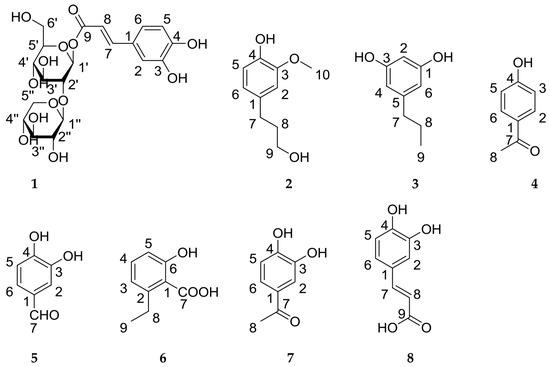 The known compounds (Figure 2) were identified as dihydroconiferyl alcohol (2) [13], 1,3-dihydroxyl-5-propylbenzene (3) [14], 4-hydroxyacetophenone (4) [15], 3,4-dihydroxybenzaldehyde (5) [16], 2-ethyl-6-hydroxybenzoic acid (6) [17], 3,4-dihydroxyacetophenone (7) [18] and caffeic acid (8) [19] through a comparison with the NMR data in the literature.