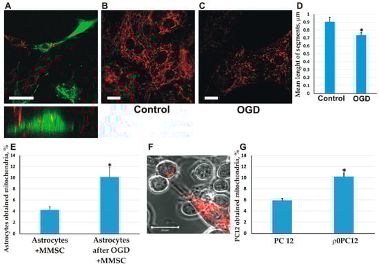 The transfer of mitochondria from MMSC to astrocytes and neural cells following mitochondrial damage. (A) Mitochondrial transfer from MMSCs to astrocytes. DsRed-labeled mitochondria from MMSC were transferred to astrocytes with GFP-labeled mitochondria. The intracellular location of red fluorescence was confirmed using confocal line-scanning microscope analysis of cells along the z-axis (bottom); (B–D) Mitochondrial fragmentation in astrocytes stained with TMRE (tetramethylrhodamine, ethyl ester) after 5 h of oxygen-glucose deprivation (OGD). Averagely shorter mitochondrial fragments (D) supports mitochondrial fragmentation; (E) The efficacy of mitochondrial transfer from MMSС to astrocytes is increased after OGD; (F) The transfer of DsRed-labeled mitochondria from ММСК to ρ0 PC12 cells; (G) MMSCs more efficiently transferred mitochondria to ρ0 PC12 cells than to native PC12 cells. Scale bars = 10 µm (A, B), and 20 µm (F). All experiments were performed at least in triplicate; * denotes significant differences between groups (p < 0.05) (One-way ANOVA, followed by Tukey’s post hoc analysis). Values are given as mean ± standard error of the mean (SEM).
