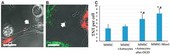 Mitochondria transfer from MMSCs to neural cells is supported by tunneling nanotubes (TNT). Formation of TNT between MMSC with DsRed-labelled mitochondria and unlabeled PC12 cells (A) and MMSC with GFP-labelled mitochondria and DsRed-labelled astrocytes (B); MMSC-derived mitochondria are seen in TNT (arrows). More TNTs are observed after OGD or overexpression of Miro1 in MMSC (C). Scale bars = 20 µm (A,B). All experiments were performed at least in triplicate; *,# denotes significant differences with respect to the MMSC group (p < 0.05) or the MMSC + Astrocytes group, (One-way ANOVA, followed by Tukey’s post hoc). Values are given as mean ± standard error of the mean (SEM).